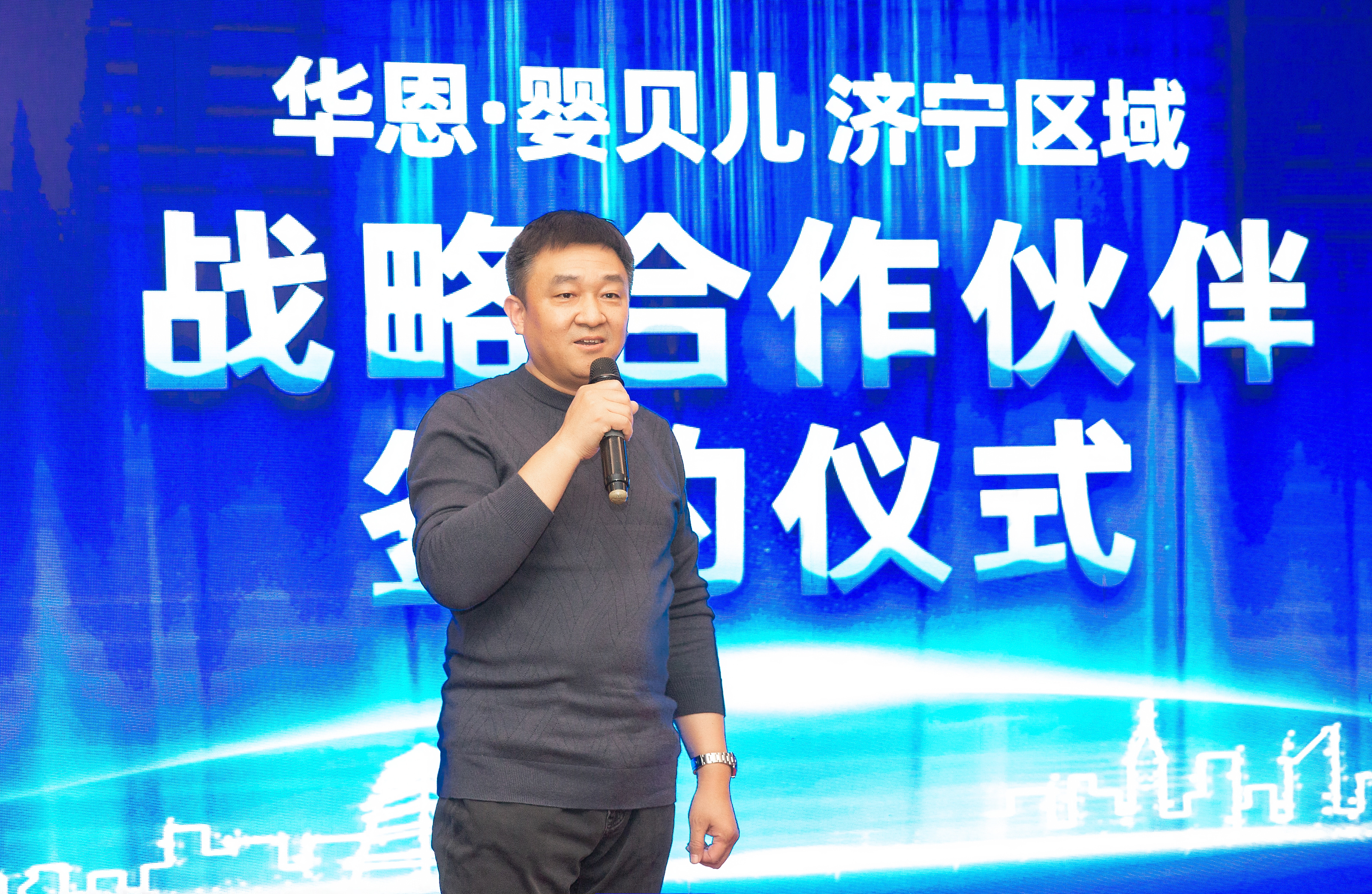 贾俊勇在致辞中首先表示非常感谢与大家共同见证华恩金年会·jinnian(金字招牌)诚信至上与济宁区域母婴行业伙伴的战略合作签约。